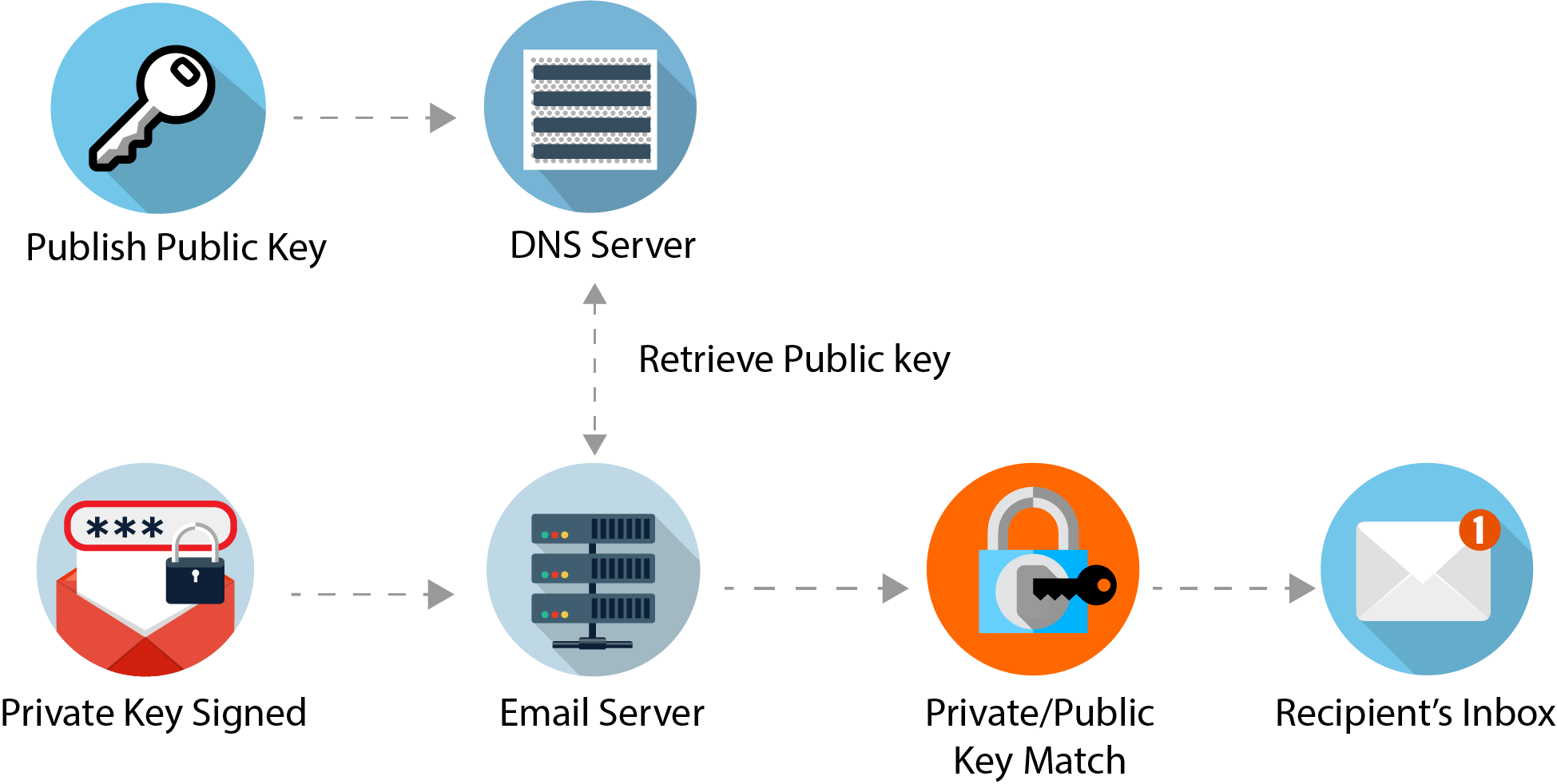 DKIM es una tecnología gratuita que se utiliza para vincular una parte del correo electrónico a un dominio. Cuando se envía un correo electrónico, se firma con una clave de dominio privado y luego se valida en el servidor de correo receptor (o ISP) con una clave pública que se encuentra dentro del DNS. Esta acción autentica que el contenido del correo electrónico no se modificó durante su transferencia. Evita que alguien intercepte su correo electrónico, lo modifique y luego lo envíe junto con la información alterada.